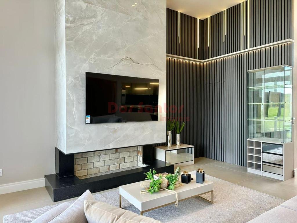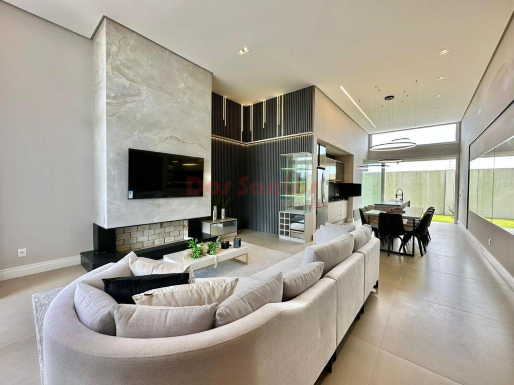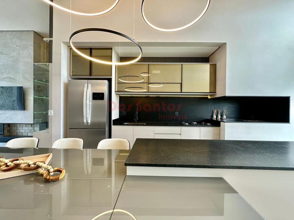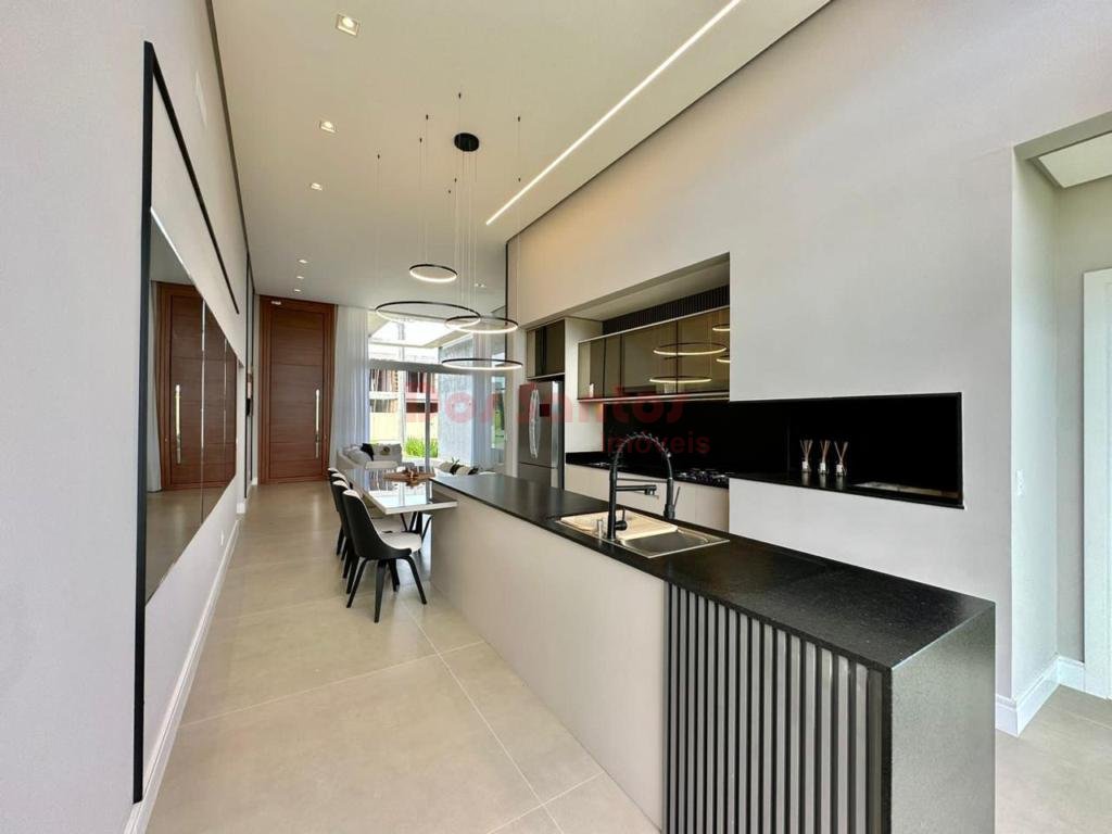 Residência nunca habitada no condomínio Arenas. Imóvel com 4 suítes, finamente mobiliado e decorado. As suítes possuem revestimento em porcelanato, além de lavabo, ampla sala de estar com mais de 60m², área de serviço ampla e separada, lareira revestida em porcelanato, churrasqueira e depósito. A casa conta com aberturas em PVC com automação, porta de entrada ripada com 4 metros de altura, paisagismo completo, teto 100% rebaixado em gesso, espera para carregador automotivo, pisos em porcelanato acetinado 120x120, arco de garagem em concreto aparente, fachada com revestimento em pedras naturais e iluminação arquitetônica. As áreas úmidas possuem revestimento, há esperas para splits e sistema de irrigação automatizada no jardim.
